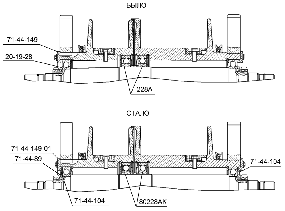 С целью улучшения герметичности барабана 71-44-103СП дополнительно установлены два маслоотражателя 71-44-104, что повлекло за собой следующие замены: