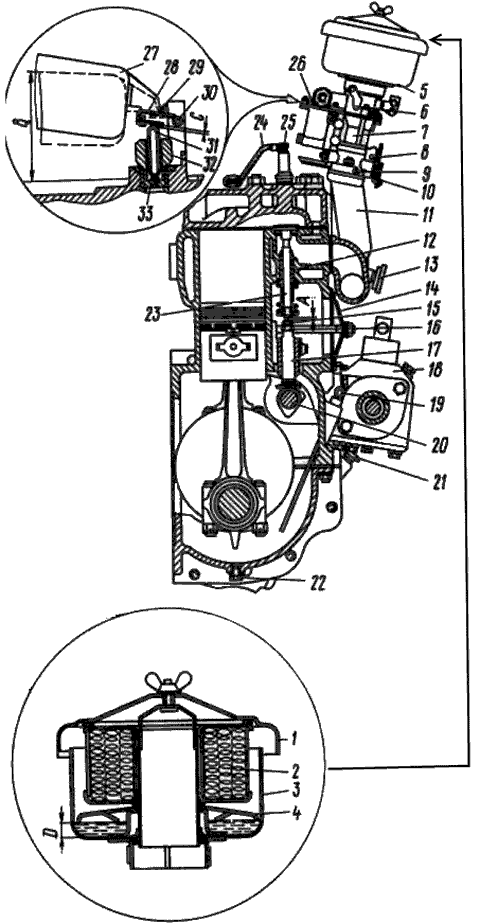 • отрегулировать уровень топлива в поплавковой камере. Уровень топлива при избыточном давлении 0,02 МПа (0,2 кгс/см²) должен быть в пределах 18,5-21,5 мм от верхней плоскости поплавковой камеры, что обеспечивается правильной установкой поплавка 27 (см. рис. 21).