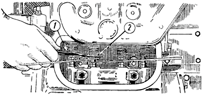 Проверьте зазоры 2 ( рис. 134 ) щупом 1 между торцами стержней клапанов и регулировочных болтов толкателей клапанов. У прогретого двигателя зазор у обоих клапанов должен быть равен 0,2...0,25 мм. Если зазор больше или меньше 0,2...0,25 мм, то отпустите контргайку на регулировочном болте толкателя и, вращая его, установите зазор 0,2...0,25 мм, после чего затяните контргайку и вновь проверьте зазор. Проверните коленчатый вал на два оборота и вновь проверьте зазоры.