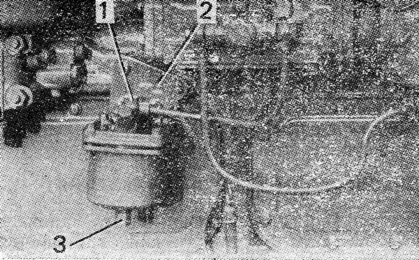 Закройте проходной кран топливного бака и слейте топливо из фильтра, вывернув пробку 3 (рис. 187) из сливного отверстия. Отсоедините от фильтра топливные трубки, вывернув пустотелые болты крепления 1. Выверните болты с гайками крепления фильтра к кронштейну 2 дизеля и снимите фильтр.