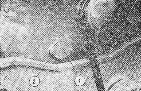 Отверните два болта 2 ( рис. 185 ) крепления крышки 1 на кожухе шестерен распределения и снимите крышку. Проворачивайте коленчатый вал дизеля через пусковой двигатель на ускоренной передаче с помощью механизма проворачивания вала пускового двигателя до тех пор, пока зуб малого венца шестерни распределительного вала с меткой С не установится против лючка. Приклейте солидолом выступающую часть прокладки к кожуху шестерен распределения. Приклейте солидолом пробковую прокладку в выемку корпуса регулятора. Прокладка должна выступать относительно плоскости регулятора, прилегающей к кожуху шестерен распределения, на 0,5...1 мм.