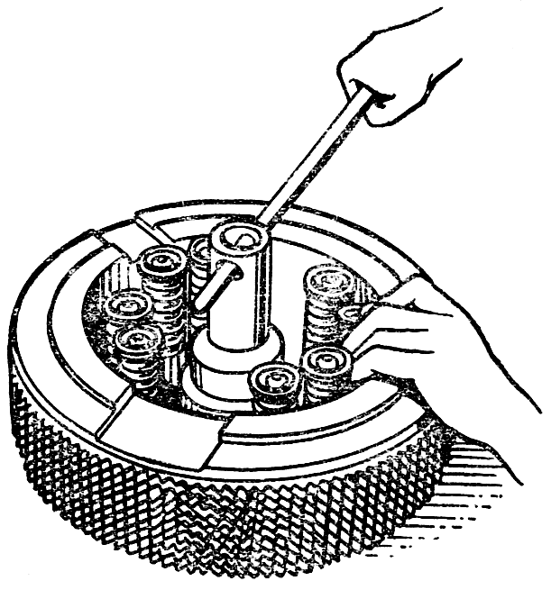 Установите на бортовой фрикцион приспособление ( рис. 234 ) и сожмите пружины. Выньте из выточек пальцев 19 ( см. рис. 232 ) сухари 20. Медленно поднимите шток приспособления до полного разжатия пружин 17 и 21, снимите тарелки 18 и пружины. Установите бортовой фрикцион на торец внутреннего барабана 24 и снимите нажимную тарелку 4, кольцо 5 и диски 2 и 5 с наружными и внутренними зубьями. Снимите замковое кольцо 12, отверните гайку 11 с нажимной тарелки и спрессуйте корпус 14 упорного подшипника 8 с подшипником в сборе с нажимной тарелки. Снимите замковое кольцо 9 и отражатель 13. Выпрессуйте упорный подшипник из корпуса стержнем диаметром 5 мм через два отверстия в корпусе.