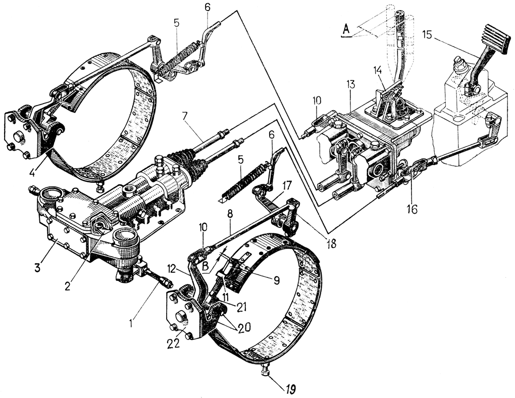 Рис. 219. Тормоза и механизм управления тормозами