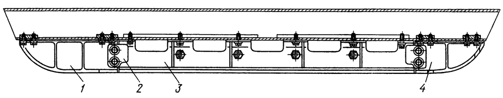 Для защиты ходового аппарата от камней и твердых осколков мерзлого грунта на рамы гусеничных тележек по требованию заказчиков устанавливают защитное устройство (рис. 87). Оно состоит из штампосварных щитков 3 и литых стальных отбойников 1, 4. Щитки и отбойники крепятся к трубам рам тележек. Средние щитки дополнительно фиксируются в поперечном направлении накладками 2, прикрепленными к отбойникам.
