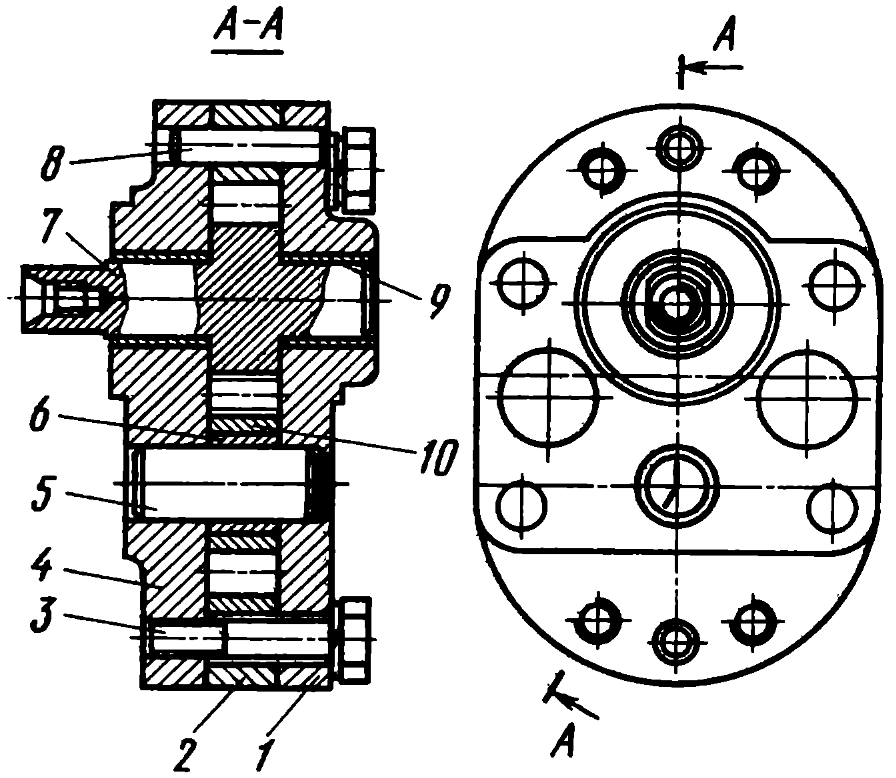 Устроен и работает насос следующим образом. При вращении ведущего вала коробки передач вращается шестерня 6 (см. рис. 77) вращая шестерни 7 и 10 (см. рис. 78) насоса. Масло засасывается через маслоприемник и под давлением поступает в смазочную систему. Шестерни насоса вращаются во втулках 6 и 9. Корпус насоса 2 закрыт крышками 1 и 4. Крышки и корпус стянуты болтами. Правильность установки обеспечивается штифтом 8.
